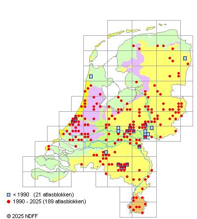 Het aantal atlasblokken (5x5 km) waarin de soort is gemeld binnen een periode van vijf jaar (vanaf 1980) of twintig jaar. Niet gecorrigeerd voor waarnemersinspanning en het aantal doorgegeven waarnemingen kan sterk variëren per periode, dus een trend in verspreiding kan hier niet direct uit worden afgelezen. Het opgegeven jaartal is het eerste jaar van de periode. Bron: gevalideerde waarnemingen uit de NDFF.