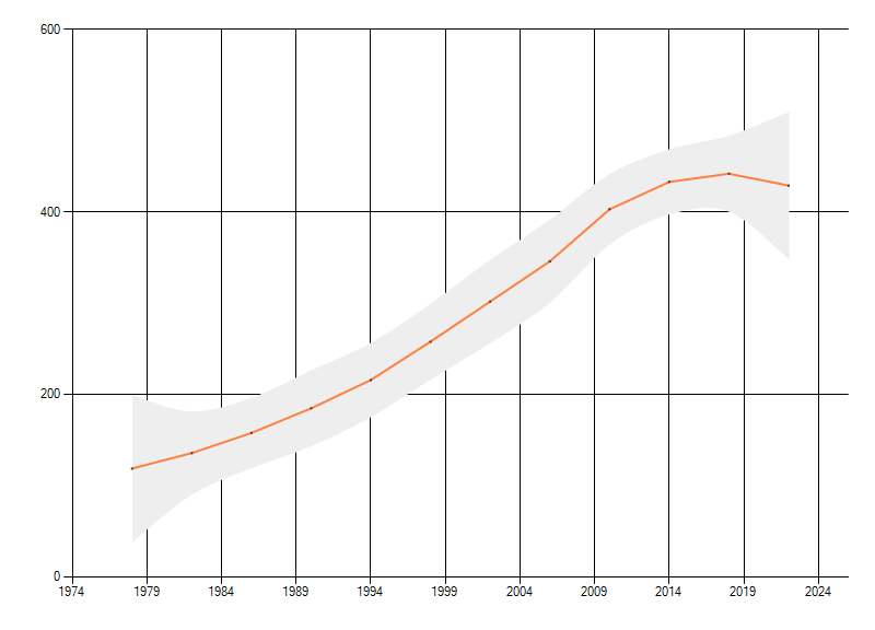 Gemiddelde trend van het aantal kilometerhokken waarin de soort voorkomt, weergegeven als indexcijfer (1975-1978 = 100). De trend is gecorrigeerd voor waarnemersinspanning en geeft de relatieve verandering in het aantal bezette kilometerhokken weer. Voor de berekening worden de data per periode van vier jaar samengenomen. In de grafiek correspondeert ieder punt met het laatste jaar van zo'n periode.