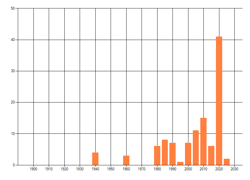 Het aantal atlasblokken (5x5 km) waarin de soort is gemeld binnen een periode van vijf jaar (vanaf 1980) of twintig jaar. Niet gecorrigeerd voor waarnemersinspanning en het aantal doorgegeven waarnemingen kan sterk variëren per periode, dus een trend in verspreiding kan hier niet direct uit worden afgelezen. Het opgegeven jaartal is het eerste jaar van de periode. Bron: gevalideerde waarnemingen uit de NDFF.