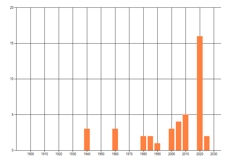 Het aantal atlasblokken (5x5 km) waarin de soort is gemeld binnen een periode van vijf jaar (vanaf 1980) of twintig jaar. Niet gecorrigeerd voor waarnemersinspanning en het aantal doorgegeven waarnemingen kan sterk variëren per periode, dus een trend in verspreiding kan hier niet direct uit worden afgelezen. Het opgegeven jaartal is het eerste jaar van de periode. Bron: gevalideerde waarnemingen uit de NDFF.