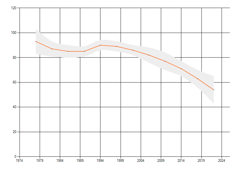 Gemiddelde trend van het aantal kilometerhokken waarin de soort voorkomt, weergegeven als indexcijfer (1975-1978 = 100).