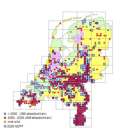 CC BY-NC-SA 3.0 NLVerspreidingNederlandVrij algemeen in Zuid-Limburg en in het ooselijke rivierengebied. Zeldzaam, maar plaatselijk vrij algemeen in Zeeland. Elders zeer zeldzaam. Niet in Flevoland en op de Waddeneilanden.