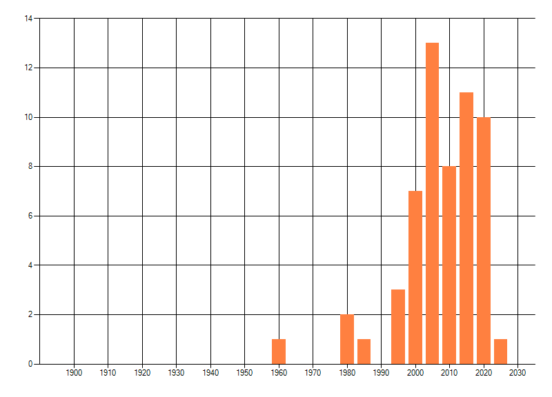 Het aantal atlasblokken (5x5 km) waarin de soort is gemeld binnen een periode van vijf jaar (vanaf 1980) of twintig jaar. Niet gecorrigeerd voor waarnemersinspanning en het aantal doorgegeven waarnemingen kan sterk variëren per periode, dus een trend in verspreiding kan hier niet direct uit worden afgelezen. Het opgegeven jaartal is het eerste jaar van de periode. Bron: gevalideerde waarnemingen uit de NDFF.