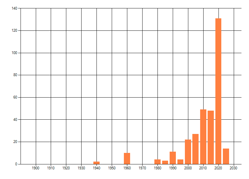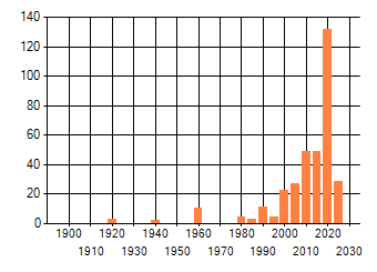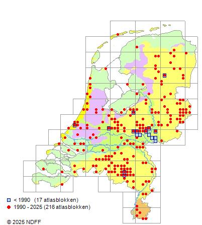 Het aantal atlasblokken (5x5 km) waarin de soort is gemeld binnen een periode van vijf jaar (vanaf 1980) of twintig jaar. Niet gecorrigeerd voor waarnemersinspanning en het aantal doorgegeven waarnemingen kan sterk variëren per periode, dus een trend in verspreiding kan hier niet direct uit worden afgelezen. Het opgegeven jaartal is het eerste jaar van de periode. Bron: gevalideerde waarnemingen uit de NDFF.