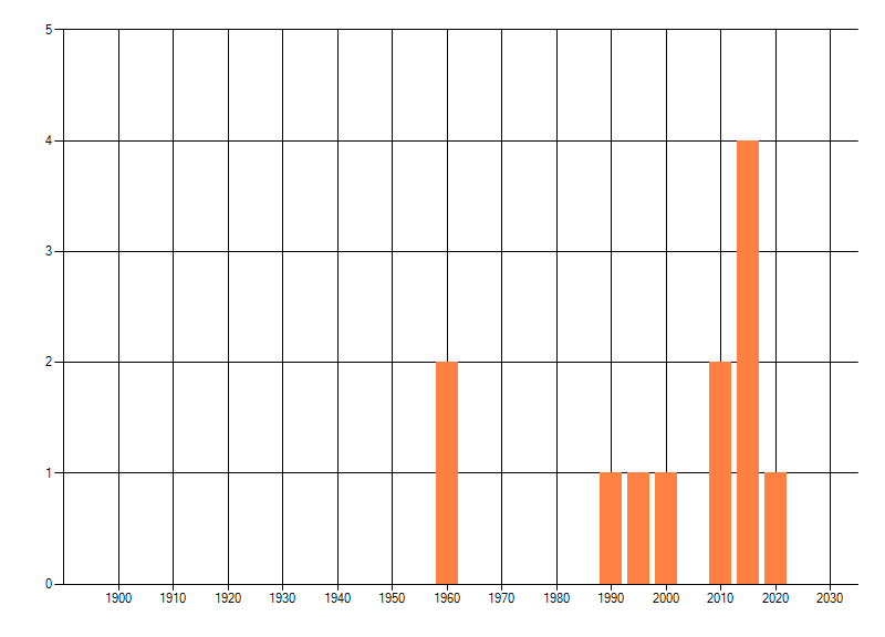 Het aantal atlasblokken (5x5 km) waarin de soort is gemeld binnen een periode van vijf jaar (vanaf 1980) of twintig jaar. Niet gecorrigeerd voor waarnemersinspanning en het aantal doorgegeven waarnemingen kan sterk variëren per periode, dus een trend in verspreiding kan hier niet direct uit worden afgelezen. Het opgegeven jaartal is het eerste jaar van de periode. Bron: gevalideerde waarnemingen uit de NDFF.