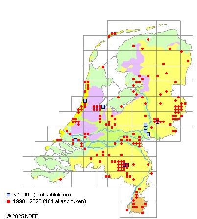 Het aantal atlasblokken (5x5 km) waarin de soort is gemeld binnen een periode van vijf jaar (vanaf 1980) of twintig jaar. Niet gecorrigeerd voor waarnemersinspanning en het aantal doorgegeven waarnemingen kan sterk variëren per periode, dus een trend in verspreiding kan hier niet direct uit worden afgelezen. Het opgegeven jaartal is het eerste jaar van de periode. Bron: gevalideerde waarnemingen uit de NDFF.
