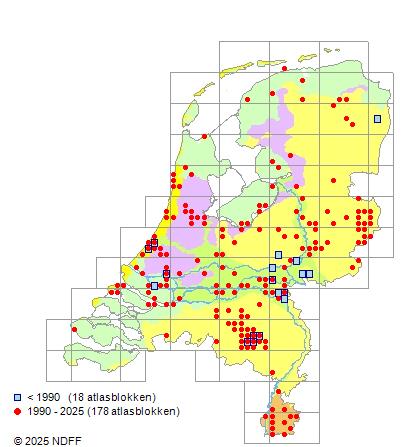 Het aantal atlasblokken (5x5 km) waarin de soort is gemeld binnen een periode van vijf jaar (vanaf 1980) of twintig jaar. Niet gecorrigeerd voor waarnemersinspanning en het aantal doorgegeven waarnemingen kan sterk variëren per periode, dus een trend in verspreiding kan hier niet direct uit worden afgelezen. Het opgegeven jaartal is het eerste jaar van de periode. Bron: gevalideerde waarnemingen uit de NDFF.
