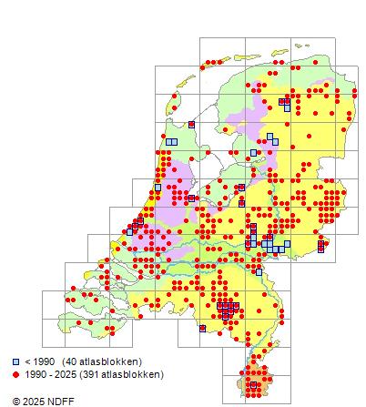 Het aantal atlasblokken (5x5 km) waarin de soort is gemeld binnen een periode van vijf jaar (vanaf 1980) of twintig jaar. Niet gecorrigeerd voor waarnemersinspanning en het aantal doorgegeven waarnemingen kan sterk variëren per periode, dus een trend in verspreiding kan hier niet direct uit worden afgelezen. Het opgegeven jaartal is het eerste jaar van de periode. Bron: gevalideerde waarnemingen uit de NDFF.