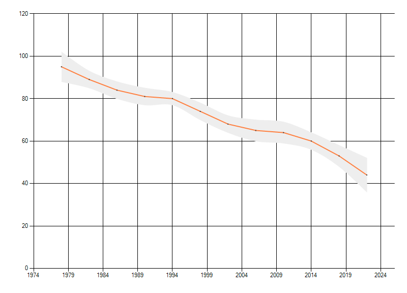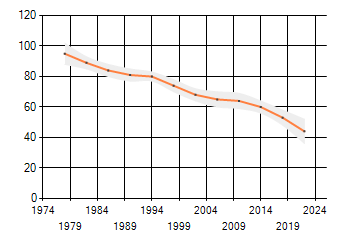 Gemiddelde trend van het aantal kilometerhokken waarin de soort voorkomt, weergegeven als indexcijfer (1975-1978 = 100).