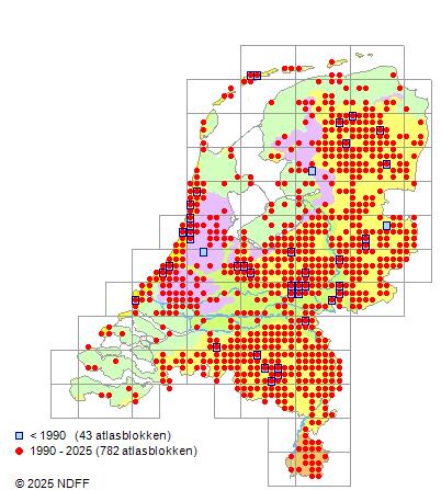 Het aantal atlasblokken (5x5 km) waarin de soort is gemeld binnen een periode van vijf jaar (vanaf 1980) of twintig jaar. Niet gecorrigeerd voor waarnemersinspanning en het aantal doorgegeven waarnemingen kan sterk variëren per periode, dus een trend in verspreiding kan hier niet direct uit worden afgelezen. Het opgegeven jaartal is het eerste jaar van de periode. Bron: gevalideerde waarnemingen uit de NDFF.