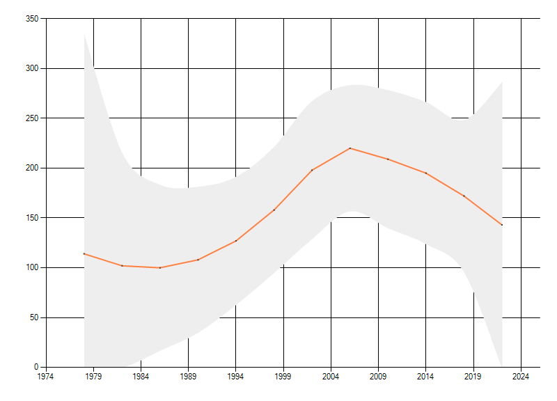 In de grafiek correspondeert ieder punt met het laatste jaar van zo'n periode. © NEM(CBS & FLORON) 2023