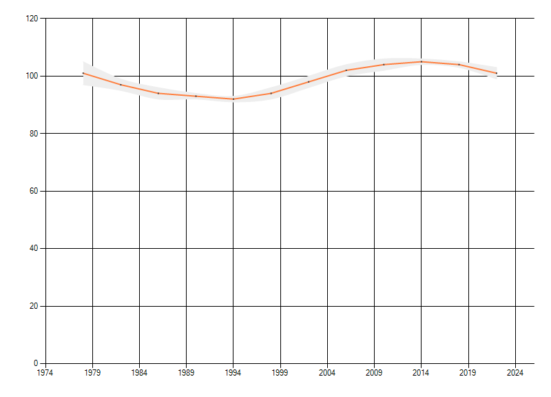 Gemiddelde trend van het aantal kilometerhokken waarin de soort voorkomt, weergegeven als indexcijfer (1975-1978 = 100). De trend is gecorrigeerd voor waarnemersinspanning en geeft de relatieve verandering in het aantal bezette kilometerhokken weer. Voor de berekening worden de data per periode van vier jaar samengenomen. In de grafiek correspondeert ieder punt met het laatste jaar van zo'n periode.