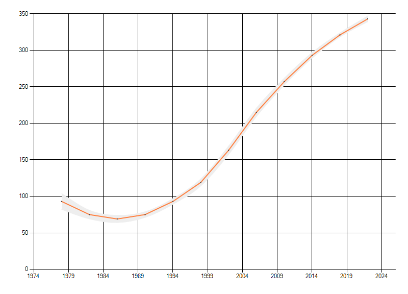 In de grafiek correspondeert ieder punt met het laatste jaar van zo'n periode. © NEM(CBS & FLORON) 2023