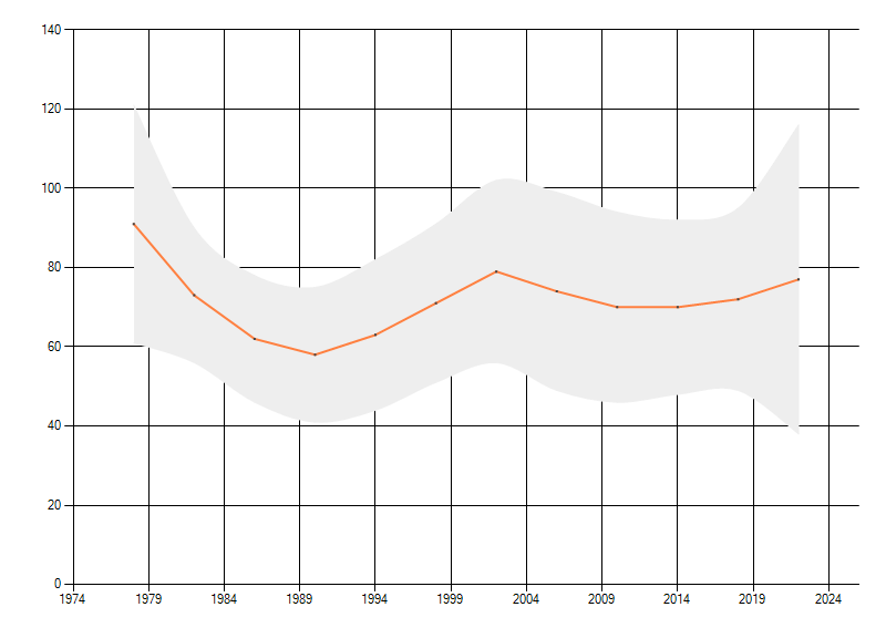 Gemiddelde trend van het aantal kilometerhokken waarin de soort voorkomt, weergegeven als indexcijfer (1975-1978 = 100).