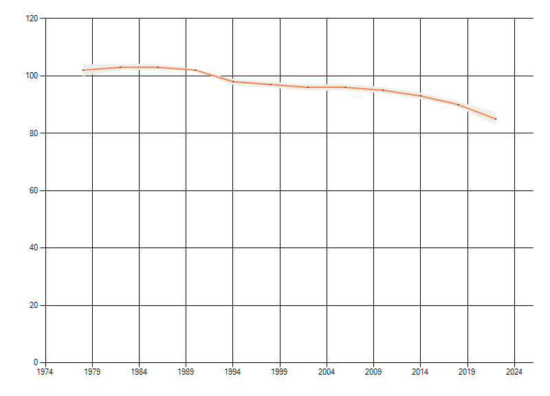Gemiddelde trend van het aantal kilometerhokken waarin de soort voorkomt, weergegeven als indexcijfer (1975-1978 = 100). De trend is gecorrigeerd voor waarnemersinspanning en geeft de relatieve verandering in het aantal bezette kilometerhokken weer. Voor de berekening worden de data per periode van vier jaar samengenomen. In de grafiek correspondeert ieder punt met het laatste jaar van zo'n periode.