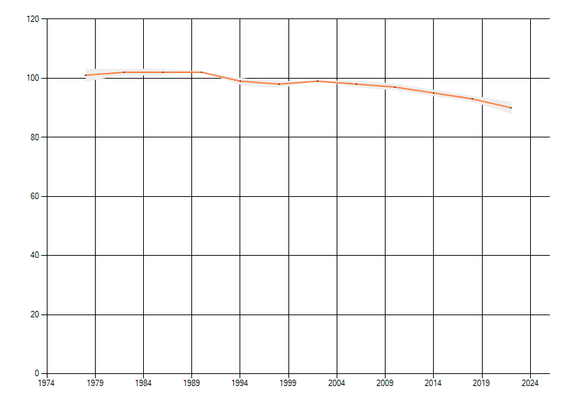 Gemiddelde trend van het aantal kilometerhokken waarin de soort voorkomt, weergegeven als indexcijfer (1975-1978 = 100). De trend is gecorrigeerd voor waarnemersinspanning en geeft de relatieve verandering in het aantal bezette kilometerhokken weer. Voor de berekening worden de data per periode van vier jaar samengenomen. In de grafiek correspondeert ieder punt met het laatste jaar van zo'n periode.