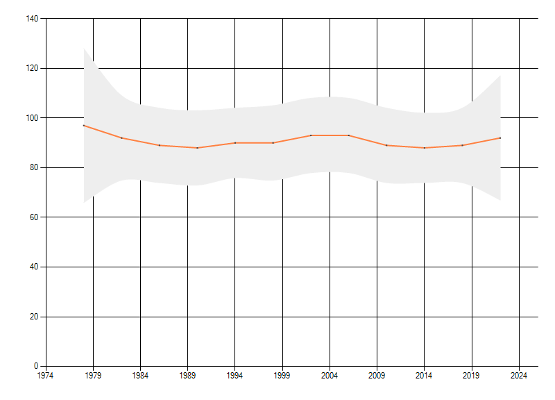 Gemiddelde trend van het aantal kilometerhokken waarin de soort voorkomt, weergegeven als indexcijfer (1975-1978 = 100). De trend is gecorrigeerd voor waarnemersinspanning en geeft de relatieve verandering in het aantal bezette kilometerhokken weer. Voor de berekening worden de data per periode van vier jaar samengenomen. In de grafiek correspondeert ieder punt met het laatste jaar van zo'n periode.