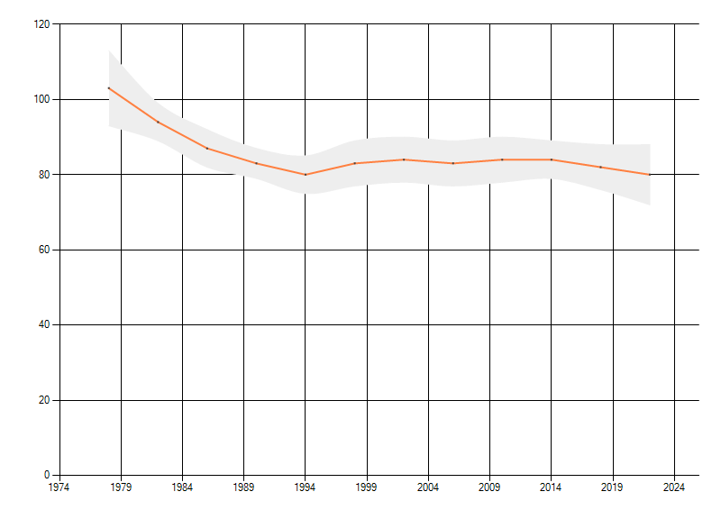 Gemiddelde trend van het aantal kilometerhokken waarin de soort voorkomt, weergegeven als indexcijfer (1975-1978 = 100).