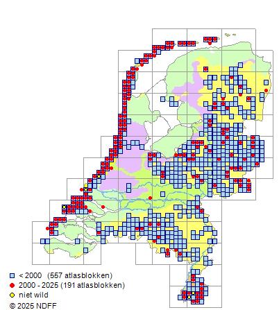 CC BY-NC-SA 3.0 NLVerspreidingNederlandPlaatselijk vrij algemeen in de duinen, zeldzaam in het oosten en midden van het land en in Zuid-Limburg. Elders zeer zeldzaam. Niet in het noordelijk zeekleigebied en in Flevoland.