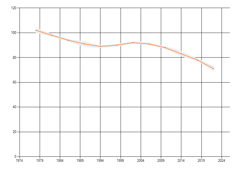 Gemiddelde trend van het aantal kilometerhokken waarin de soort voorkomt, weergegeven als indexcijfer (1975-1978 = 100).