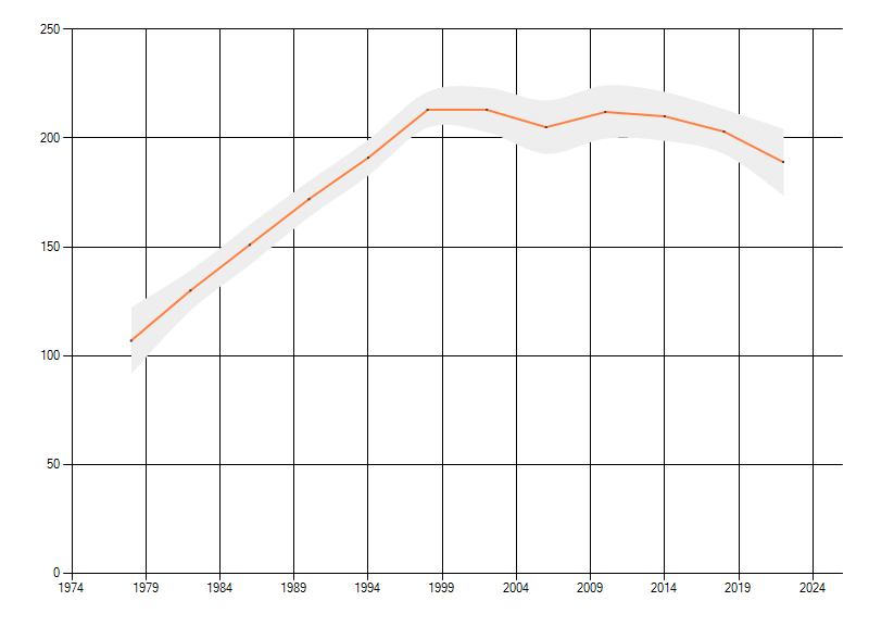 Gemiddelde trend van het aantal kilometerhokken waarin de soort voorkomt, weergegeven als indexcijfer (1975-1978 = 100). De trend is gecorrigeerd voor waarnemersinspanning en geeft de relatieve verandering in het aantal bezette kilometerhokken weer. Voor de berekening worden de data per periode van vier jaar samengenomen. In de grafiek correspondeert ieder punt met het laatste jaar van zo'n periode.