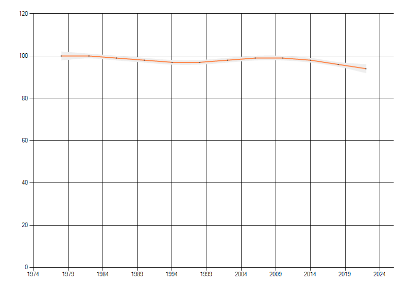 Gemiddelde trend van het aantal kilometerhokken waarin de soort voorkomt, weergegeven als indexcijfer (1975-1978 = 100). De trend is gecorrigeerd voor waarnemersinspanning en geeft de relatieve verandering in het aantal bezette kilometerhokken weer. Voor de berekening worden de data per periode van vier jaar samengenomen. In de grafiek correspondeert ieder punt met het laatste jaar van zo'n periode.