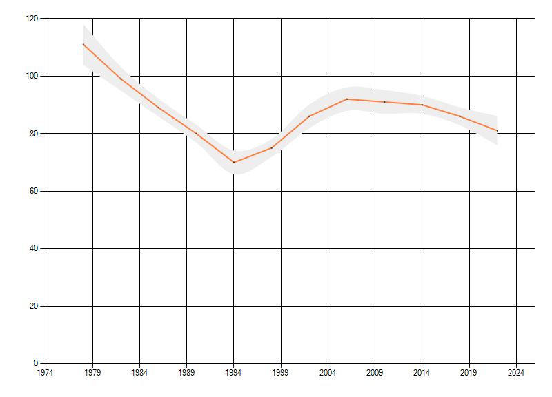 Gemiddelde trend van het aantal kilometerhokken waarin de soort voorkomt, weergegeven als indexcijfer (1975-1978 = 100). De trend is gecorrigeerd voor waarnemersinspanning en geeft de relatieve verandering in het aantal bezette kilometerhokken weer. Voor de berekening worden de data per periode van vier jaar samengenomen. In de grafiek correspondeert ieder punt met het laatste jaar van zo'n periode.