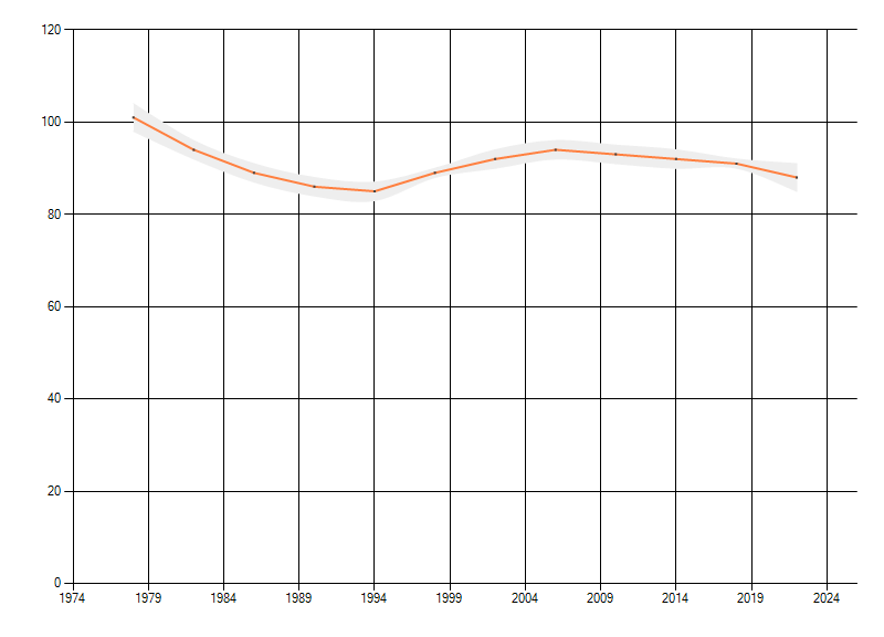 Gemiddelde trend van het aantal kilometerhokken waarin de soort voorkomt, weergegeven als indexcijfer (1975-1978 = 100). De trend is gecorrigeerd voor waarnemersinspanning en geeft de relatieve verandering in het aantal bezette kilometerhokken weer. Voor de berekening worden de data per periode van vier jaar samengenomen. In de grafiek correspondeert ieder punt met het laatste jaar van zo'n periode.