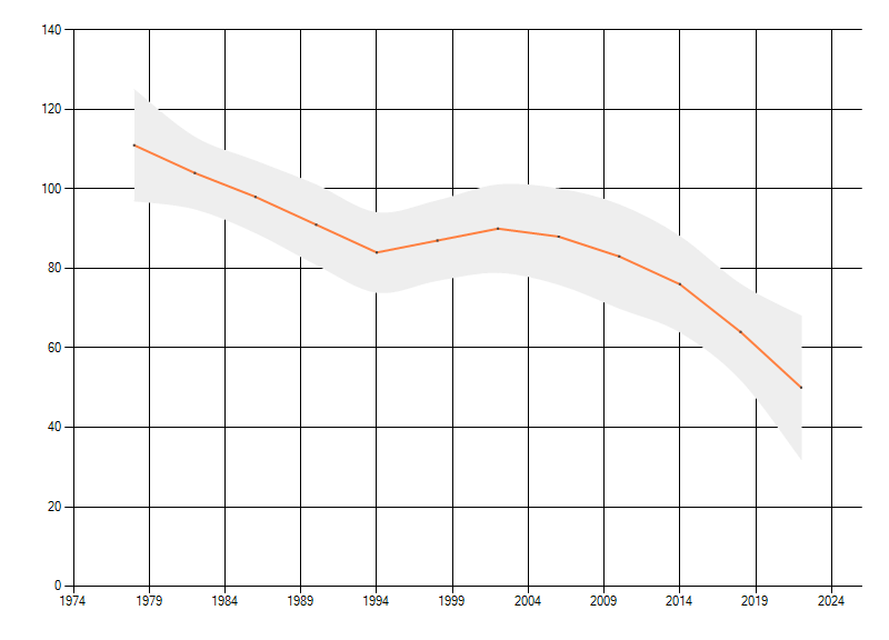 Gemiddelde trend van het aantal kilometerhokken waarin de soort voorkomt, weergegeven als indexcijfer (1975-1978 = 100).