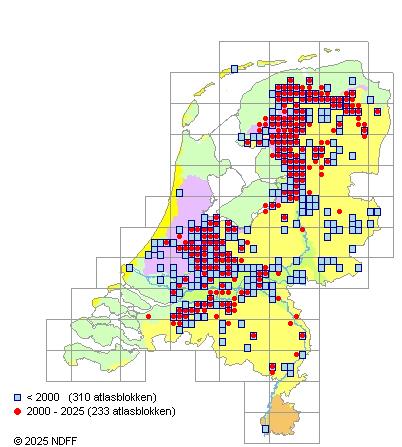 CC BY-NC-SA 3.0 NLVerspreidingNederlandVrij zeldzaam in laagveengebieden en in het rivierengebied, zeldzaam in het oosten en midden van het land en zeer zeldzaam in de Hollandse duinen. Niet in het Deltagebied en op de Waddeneilanden.