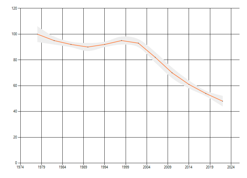 Gemiddelde trend van het aantal kilometerhokken waarin de soort voorkomt, weergegeven als indexcijfer (1975-1978 = 100).
