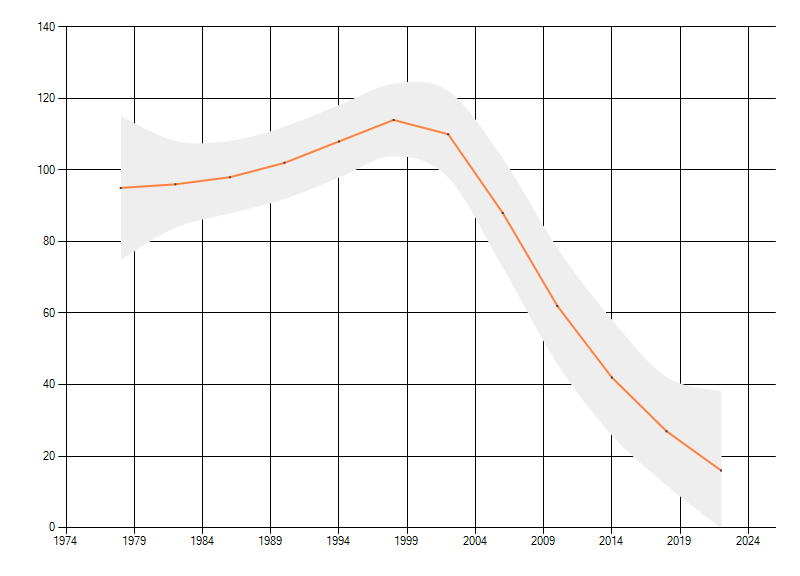 Gemiddelde trend van het aantal kilometerhokken waarin de soort voorkomt, weergegeven als indexcijfer (1975-1978 = 100). De trend is gecorrigeerd voor waarnemersinspanning en geeft de relatieve verandering in het aantal bezette kilometerhokken weer. Voor de berekening worden de data per periode van vier jaar samengenomen. In de grafiek correspondeert ieder punt met het laatste jaar van zo'n periode.