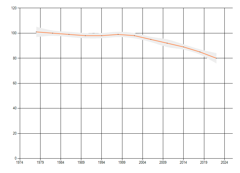 Gemiddelde trend van het aantal kilometerhokken waarin de soort voorkomt, weergegeven als indexcijfer (1975-1978 = 100).