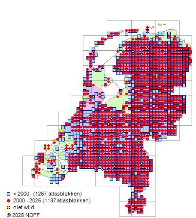 De trend is gecorrigeerd voor waarnemersinspanning en geeft de relatieve verandering in het aantal bezette kilometerhokken weer.