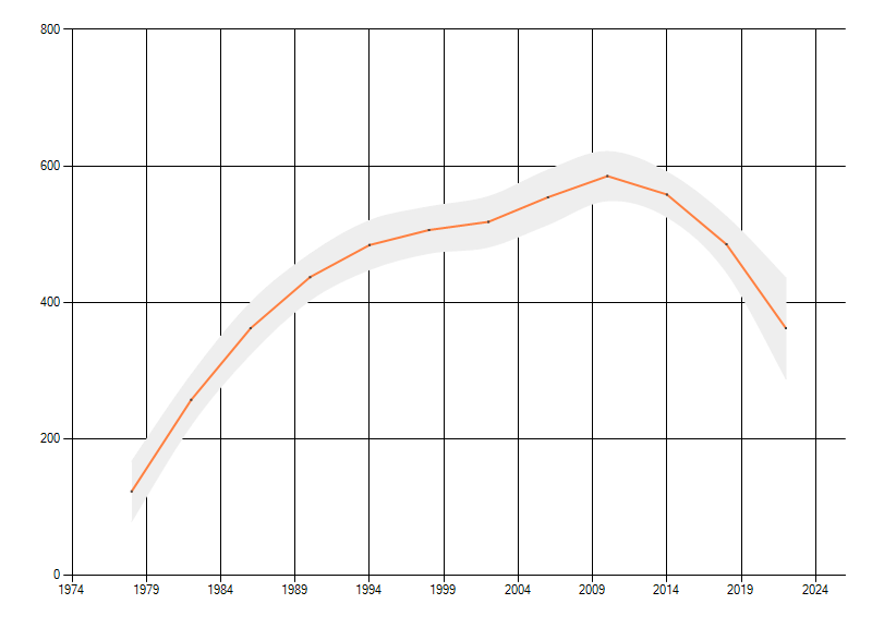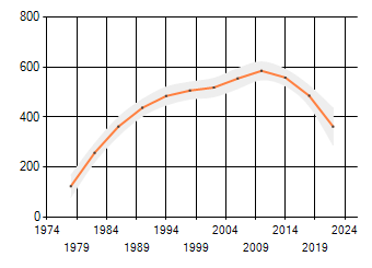 Gemiddelde trend van het aantal kilometerhokken waarin de soort voorkomt, weergegeven als indexcijfer (1975-1978 = 100).