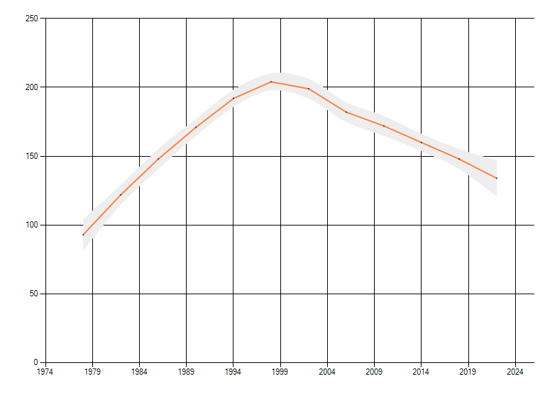 In de grafiek correspondeert ieder punt met het laatste jaar van zo'n periode. © NEM(CBS & FLORON) 2023