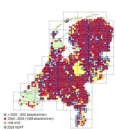De trend is gecorrigeerd voor waarnemersinspanning en geeft de relatieve verandering in het aantal bezette kilometerhokken weer.