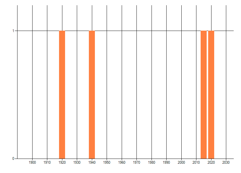 Het aantal atlasblokken (5x5 km) waarin de soort is gemeld binnen een periode van vijf jaar (vanaf 1980) of twintig jaar. Niet gecorrigeerd voor waarnemersinspanning en het aantal doorgegeven waarnemingen kan sterk variëren per periode, dus een trend in verspreiding kan hier niet direct uit worden afgelezen. Het opgegeven jaartal is het eerste jaar van de periode. Bron: gevalideerde waarnemingen uit de NDFF.