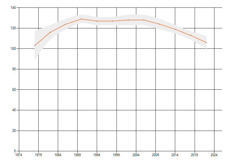 Gemiddelde trend van het aantal kilometerhokken waarin de soort voorkomt, weergegeven als indexcijfer (1975-1978 = 100).