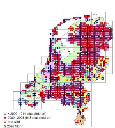 CC BY-NC-SA 3.0 NLVerspreidingNederlandPlaatselijk vrij algemeen op de Waddeneilanden, in laagveengebieden, Drenthe, Zuidoost- Fryslân, Gelderland, Noord-Brabant en Zeeuws Vlaanderen. Elders zeldzaam. Niet in Zuid-Limburg.