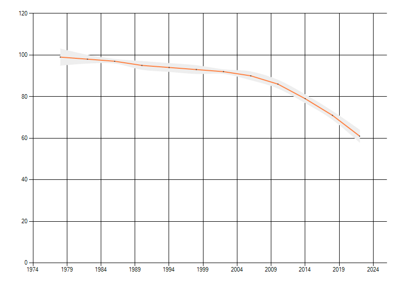 Gemiddelde trend van het aantal kilometerhokken waarin de soort voorkomt, weergegeven als indexcijfer (1975-1978 = 100).