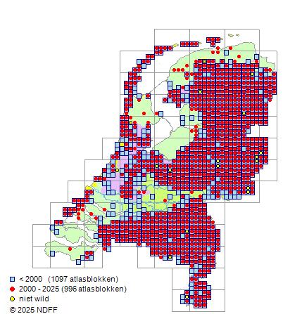 CC BY-NC-SA 3.0 NLVerspreidingNederlandVrij algemeen in het oosten en midden van het land en in de duinen en vrij zeldzaam in Zuid-Limburg en in laagveengebieden. Elders zeer zeldzaam of ontbrekend.