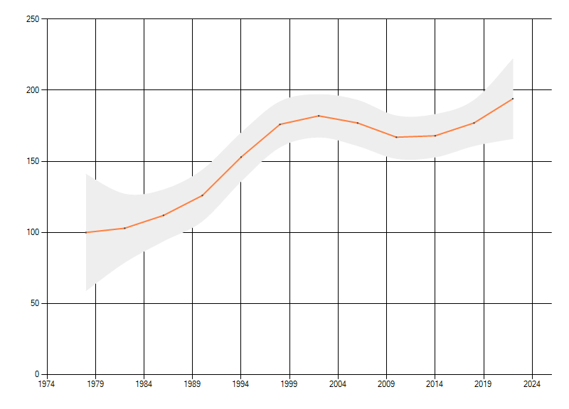 Gemiddelde trend van het aantal kilometerhokken waarin de soort voorkomt, weergegeven als indexcijfer (1975-1978 = 100). De trend is gecorrigeerd voor waarnemersinspanning en geeft de relatieve verandering in het aantal bezette kilometerhokken weer. Voor de berekening worden de data per periode van vier jaar samengenomen. In de grafiek correspondeert ieder punt met het laatste jaar van zo'n periode.