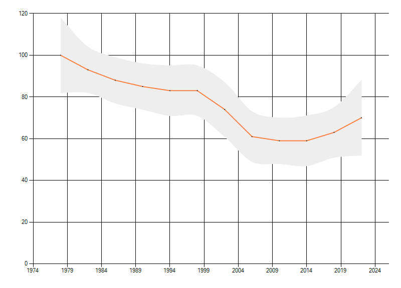 Gemiddelde trend van het aantal kilometerhokken waarin de soort voorkomt, weergegeven als indexcijfer (1975-1978 = 100).