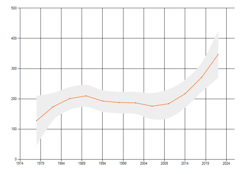 In de grafiek correspondeert ieder punt met het laatste jaar van zo'n periode.