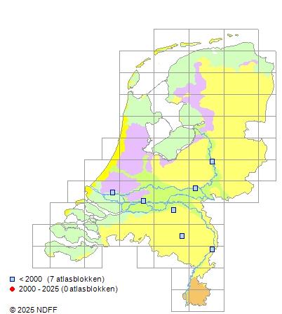 Het aantal atlasblokken (5x5 km) waarin de soort is gemeld binnen een periode van vijf jaar (vanaf 1980) of twintig jaar. Niet gecorrigeerd voor waarnemersinspanning en het aantal doorgegeven waarnemingen kan sterk variëren per periode, dus een trend in verspreiding kan hier niet direct uit worden afgelezen. Het opgegeven jaartal is het eerste jaar van de periode. Bron: gevalideerde waarnemingen uit de NDFF.