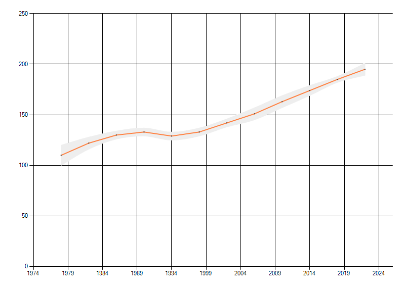 Gemiddelde trend van het aantal kilometerhokken waarin de soort voorkomt, weergegeven als indexcijfer (1975-1978 = 100).