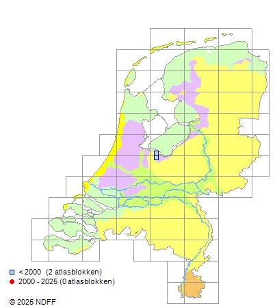 Het aantal atlasblokken (5x5 km) waarin de soort is gemeld binnen een periode van vijf jaar (vanaf 1980) of twintig jaar. Niet gecorrigeerd voor waarnemersinspanning en het aantal doorgegeven waarnemingen kan sterk variëren per periode, dus een trend in verspreiding kan hier niet direct uit worden afgelezen. Het opgegeven jaartal is het eerste jaar van de periode. Bron: gevalideerde waarnemingen uit de NDFF.