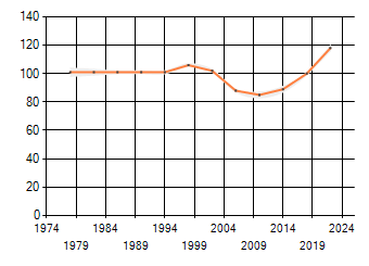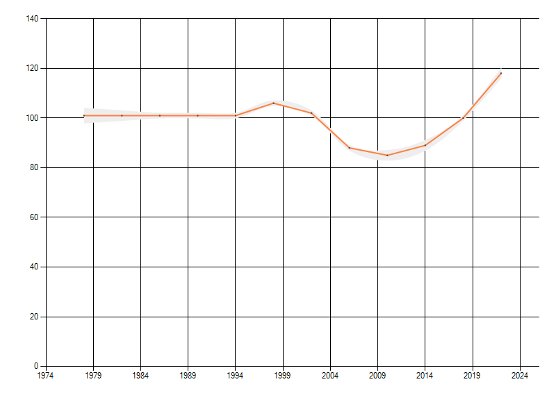 Gemiddelde trend van het aantal kilometerhokken waarin de soort voorkomt, weergegeven als indexcijfer (1975-1978 = 100).