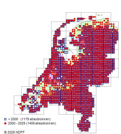 CC BY-NC-SA 3.0 NLVerspreidingNederlandAlgemeen op de hoge zandgronden en in het duingebied, vrij zeldzaam in het rivierengebied, in Flevoland en Zeeland, in laagveengebieden en in het noordelijk zeekleigebied.
